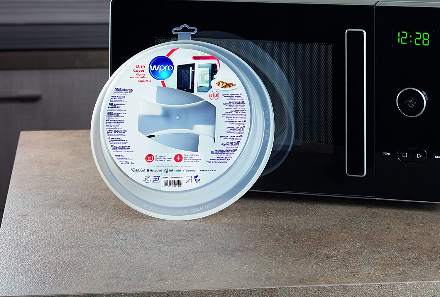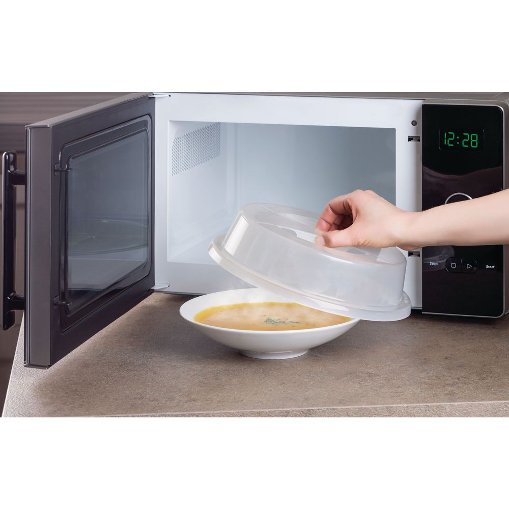 Grazie all'utilizzo di questo copripiatto si può matenere calde le nostre pietanze e inoltre protegge il forno a microonde da eventuali schizzi e macchie. Ha un materiale in plastica trasparente resistente al calore e durevole. È possibile lavarlo a mano oppure nel cestello superiore della nostra lavatrice.