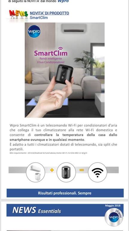 SmartClim Telecomando WI-Fi originale universale per condizionatori. Esso è un telecomando che collega il tuo climatizzatore alla rete Wi-Fi domestica e consente di controllare la temperatura della casa dal tuo smartphone ovunque (in casa e fuori casa) e in qualsiasi momento della giornata. Adatto per tutti i tipi di condizionatori dotati di telecomando, sia split che portatili. Utilizzabile tramite app ''CONTROS''. Quest'ultima è disponibile in Apple Store e Google Play. È possibile: